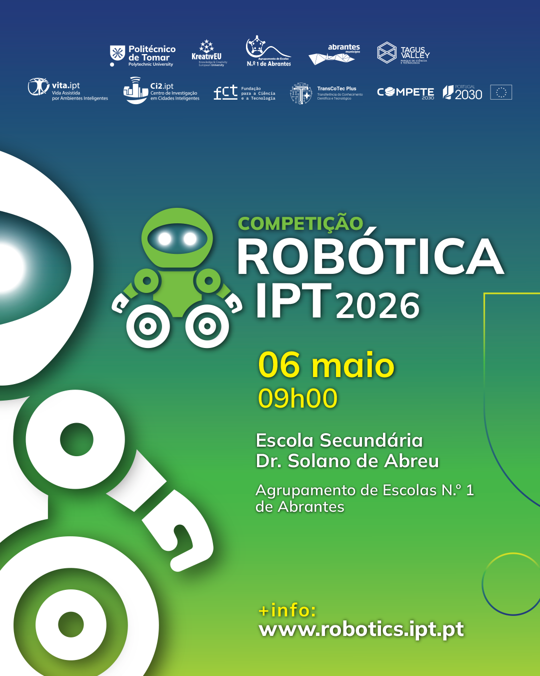 O Instituto Politécnico de Tomar vai realizar a Competição Robótica IPT 2025, no dia 6 de maio de 2026, na Escola Secundária Dr. Solano de Abreu do Agrupamento de Escolas Nº1 de Abrantes.